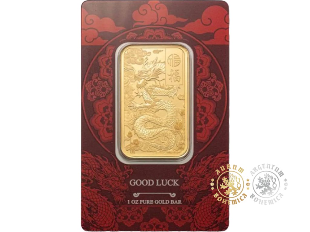 Exkluzivní 31,1g investiční zlatý slitek Good Luck Dragon od švýcarské rafinerie PAMP Suisse představuje spojení precizního zpracování, tradice a symboliky štěstí. Každý slitek je vyroben z ryzího zlata (999,9/1000) a opatřen individuálním sériovým číslem a certifikátem pravosti. Motiv draka symbolizuje sílu, prosperitu a ochranu – ideální volba pro investory i jako hodnotný dárek pro výjimečné příležitosti.