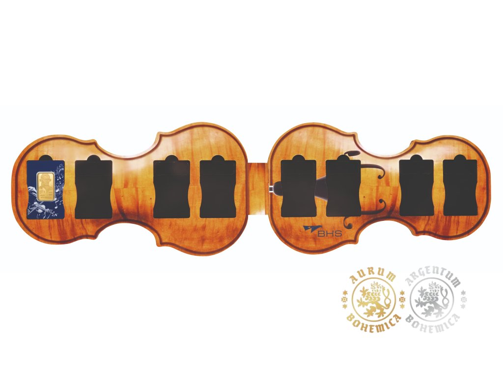 Každý slitek je uložen do výjimečného sběratelského obalu ve tvaru houslí. Nejenže tento elegantní doplněk navazuje na hudební téma, ale zároveň vnáší do celé kompozice osobitý půvab a hloubku.