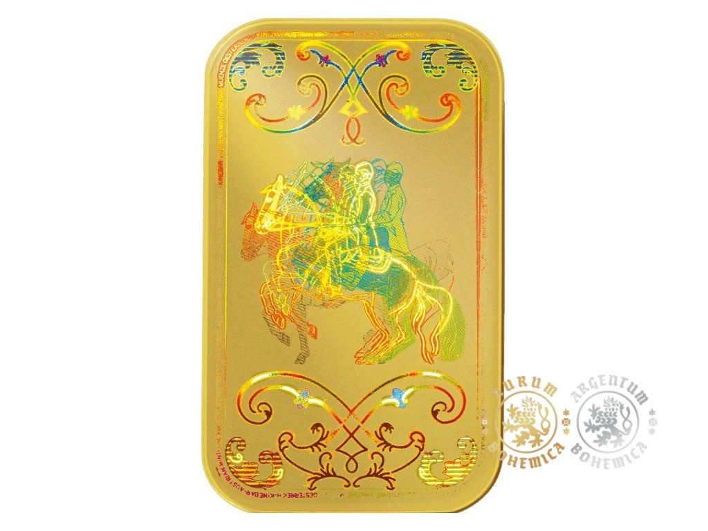 Kinebar Münze Österreich má na zadní straně slitku motiv jezdce na Lipicánu, který vlivem dopadajícího světla z různých stran mění svoji polohu.