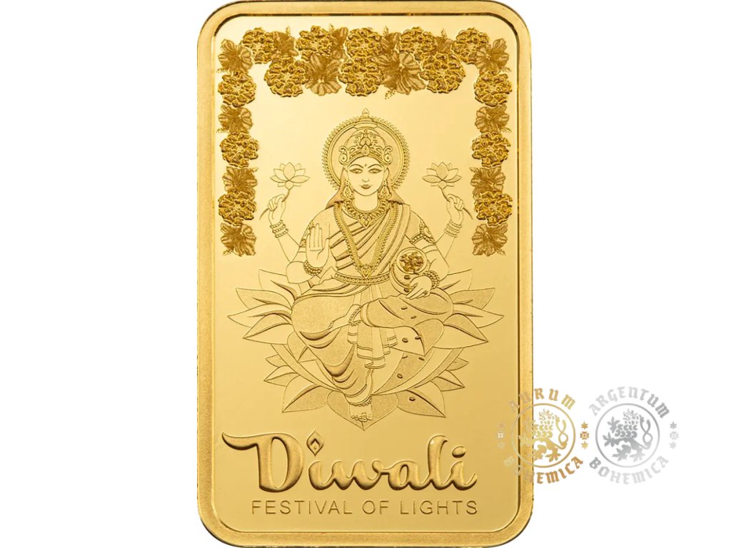 Exkluzivní 5g zlatý slitek PAMP Suisse Diwali Lakshmi & Rangoli je nádhernou kombinací investiční jistoty a uměleckého zpracování. Vyrobený ze zlata nejvyšší ryzosti 999,9/1000, nese na své lícní straně detailní vyobrazení bohyně Lakshmi, patronky bohatství a prosperity, obklopené květinovými ornamenty a sváteční symbolikou Diwali. Rubová strana pak nese logo PAMP Suisse, označení hmotnosti a ryzosti, sériové číslo a elegantní dekorativní rámeček inspirovaný tradičním indickým vzorem Rangoli. Každý kus je uložen v ochranném balení CertiPAMP™ s barevným motivem a je opatřen unikátním číslem pro snadné ověření pravosti.