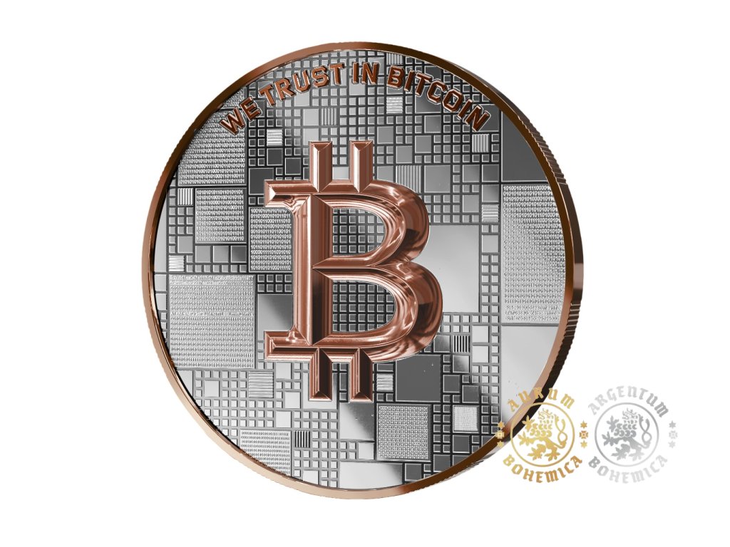 Na přední straně je výrazně vyobrazen ikonický symbol Bitcoinu, který je orámován detailním vyobrazením technologie blockchain. Nápis „We trust in Bitcoin“ posiluje důvěru v decentralizovanou měnu a odráží globální potenciál této digitální revoluce.