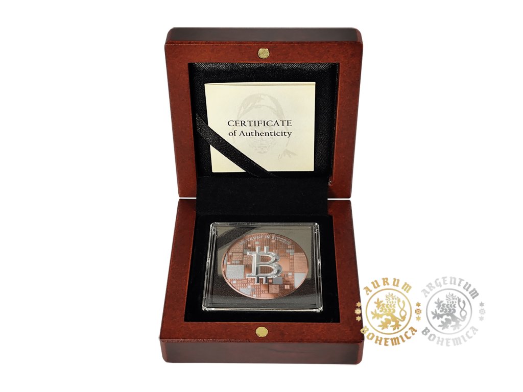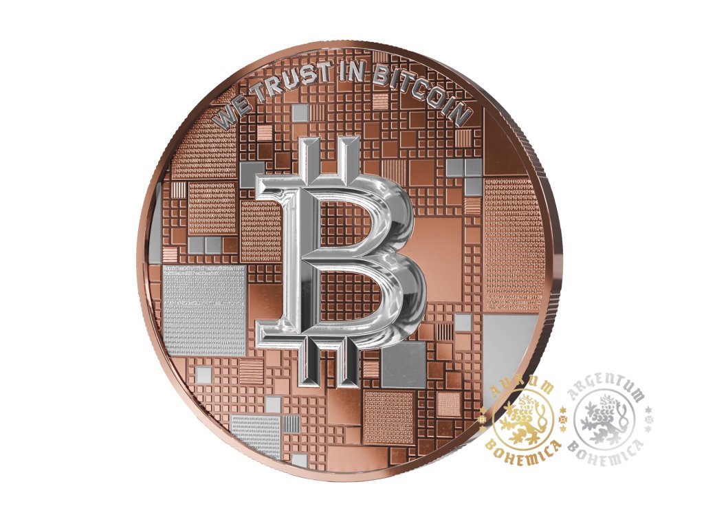 Na přední straně je výrazně vyobrazen ikonický symbol Bitcoinu, který je orámován detailním vyobrazením technologie blockchain. Nápis „We trust in Bitcoin“ posiluje důvěru v decentralizovanou měnu a odráží globální potenciál této digitální revoluce.