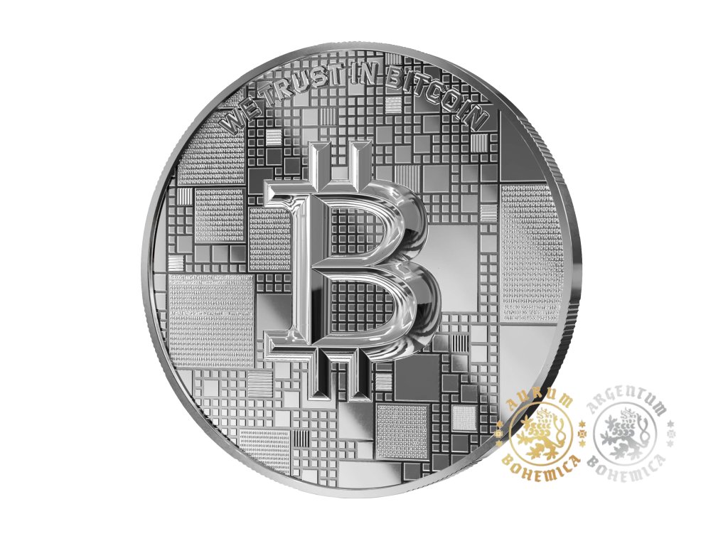 Na přední straně je výrazně vyobrazen ikonický symbol Bitcoinu, který je orámován detailním vyobrazením technologie blockchain. Nápis „We trust in Bitcoin“ posiluje důvěru v decentralizovanou měnu a odráží globální potenciál této digitální revoluce.