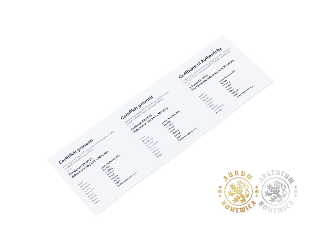 Česká mincovna zlatý pětidukát Velkomoravský kříž z Mikulčic 2021 Proof