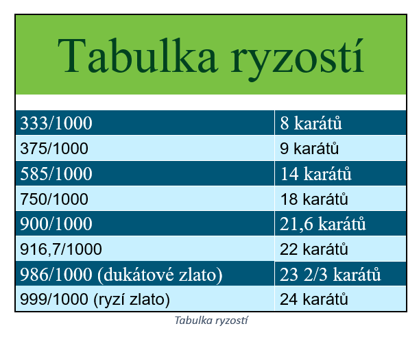 Také se můžeme setkat s např. s ryzostí 958,3/1000, což odpovídá přibližně 23 karátům.