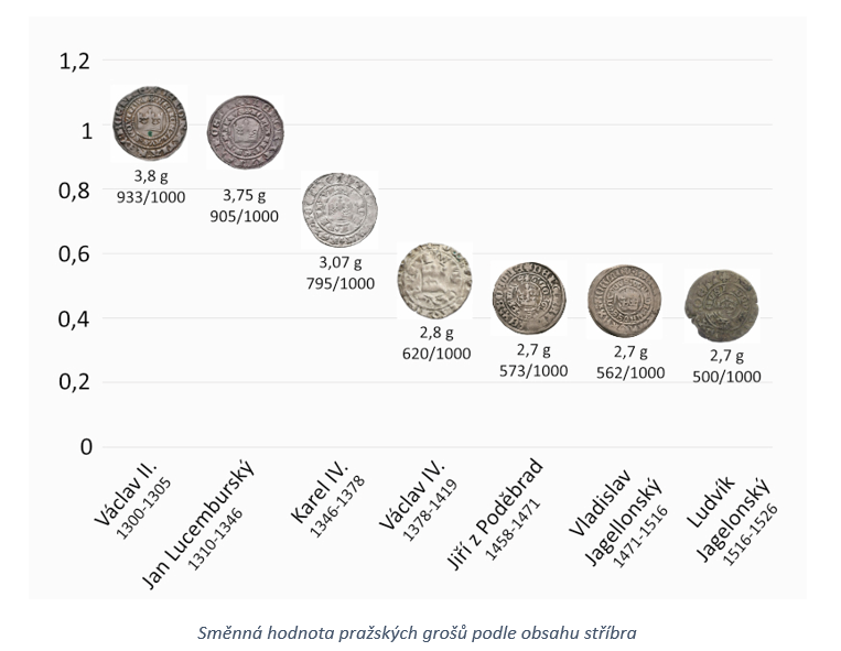 V minulosti se obsah stříbra při výrobě mincí značně lišil. Bylo to dáno zejména aktuálními ekonomickými aspekty. „Zatímco za Václava II. bylo v groši 3,55 gramu čistého stříbra, mince ražené za vlády Ludvíka Jagelonského obsahovaly už jen 1,35 gramu stříbra. V posledních groších ražených za Ferdinanda I. bylo v průměru 1,13 gramu stříbra.“