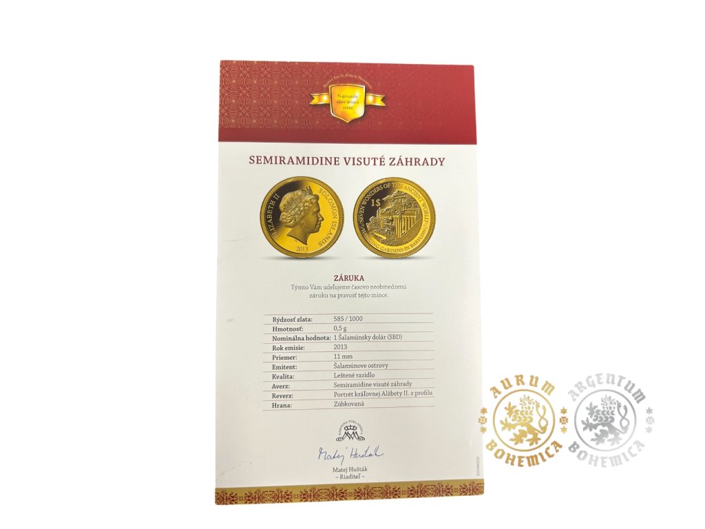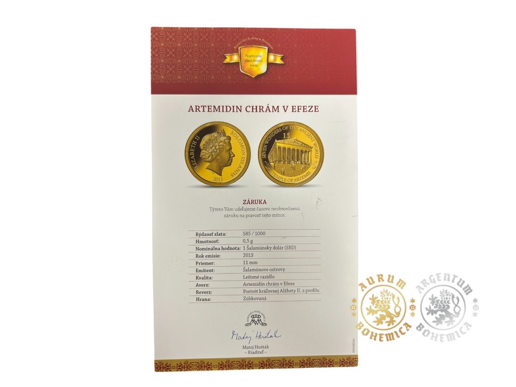 Exkluzivní sada dvou zlatých mincí z edice Nejmenší mince světa 2013 v kvalitě Proof představuje unikátní památku na starověké divy světa. Na první minci je vyobrazen slavný Artemidin chrám v Efezu, na druhé pak legendární Semiramidiny visuté zahrady. Tyto drobné, precizně zpracované mince dokazují dokonalost mincovní technologie a zároveň jsou cenným sběratelským artiklem. Sada je vydána v limitovaném nákladu a představuje atraktivní spojení umělecké a historické hodnoty s investičním potenciálem.