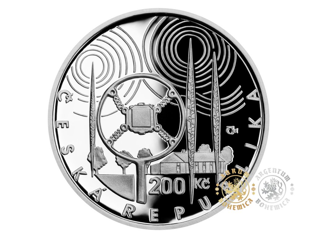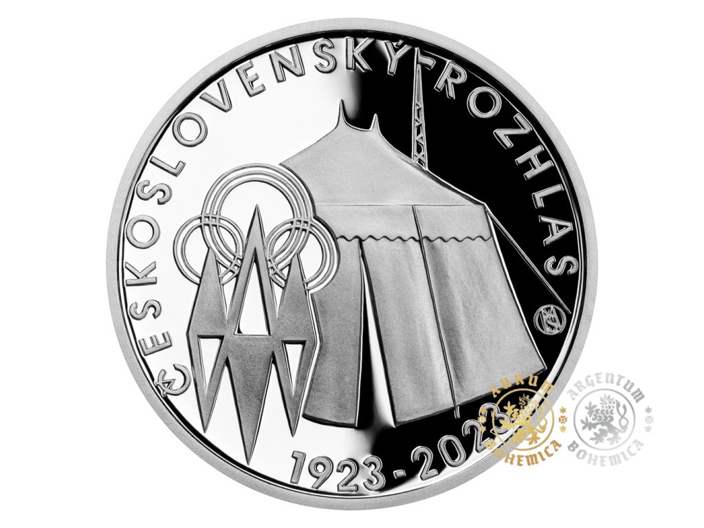 Strieborná minca Českej národnej banky s nominálnou hodnotou 200 Sk, ktorá sa môže pochváliť špičkovou kvalitou proof, vychádza pri príležitosti 100. výročia začatia pravidelného vysielania Československého rozhlasu.