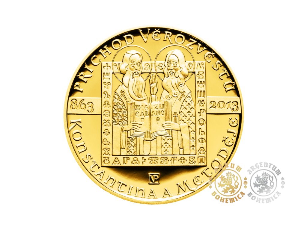- Zlatú mincu 10 000 Sk Príchod vierozvestcov Konštantína a Metoda 1 oz 2013 Proof – poctu príchodu solúnskych bratov, ktorí priniesli na Veľkú Moravu písmo a kresťanstvo.