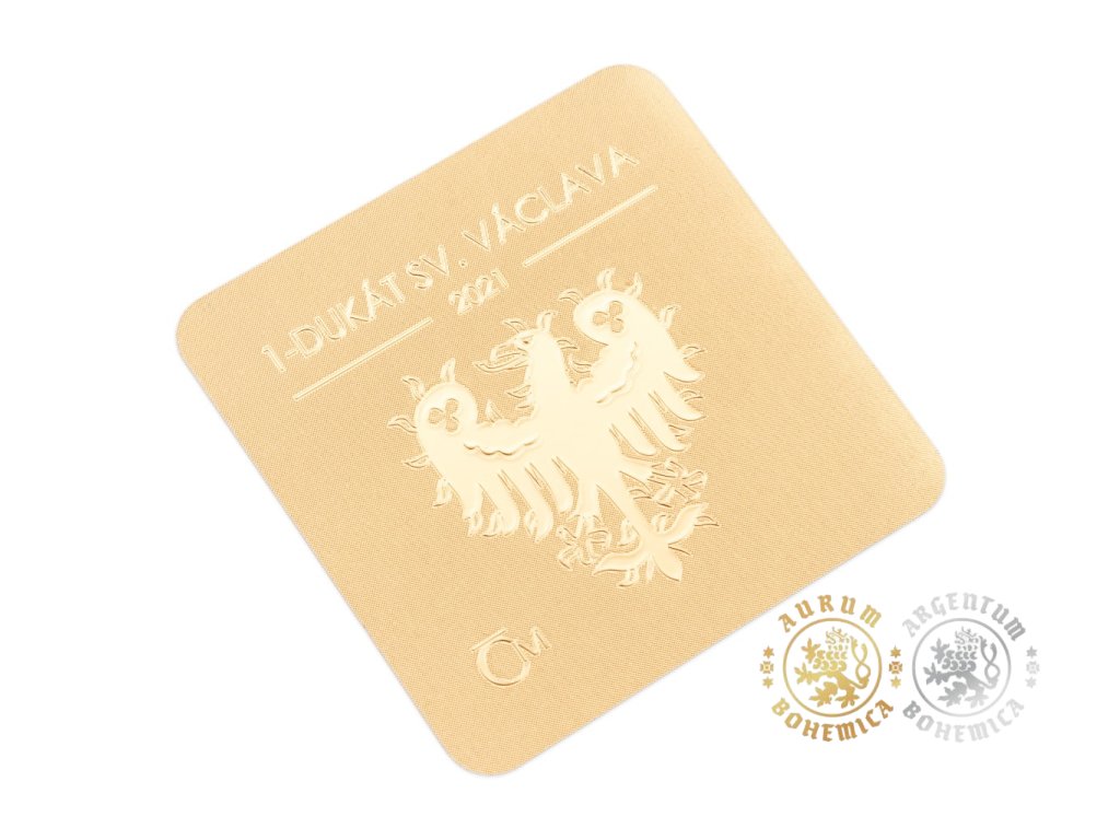 Averzná strana zlatého dukátu, ktorý je dielom medailéra Mgr. Petra Horáka, predkladá svätého Václava v podobe rytiera s prilbou, plášťom a korouhvou, na ktorej je vyobrazená plamenná orlica. Texty na averzu uvádzajú SV. VÁCLAV – 1-DUKÁT. Reverznú stranu razby potom bezo zvyšku vypĺňa plamenná orlica, ktorá v pazúroch zviera svätováclavský meč. Kompozíciu reverzu dotvára ešte letopočet 2021.
