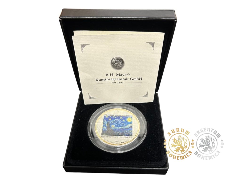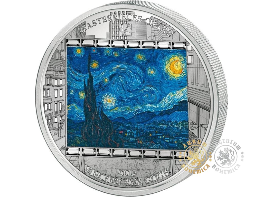 Tato mimořádná proof mince, vydaná v rámci série Masterpieces of Art (Mistrovská díla umění), byla oficiálně uvedena na tržiště Cookových ostrovů v roce 2015. Byla ražena z vysoce kvalitního stříbra s ryzostí .999, váží plných 3 unce (93,3 g) a má výrazný průměr 55 mm, což dodává minci monumentální vzhled. Na reverzní straně mincovního lístku je reprodukce ikonického obrazu Vincenta van Gogha „Hvězdná noc“ doplněná rámem z 16 autentických krystalků Swarovski — osm nahoře a osm dole, čímž podtrhují hvězdné detaily obrazu.