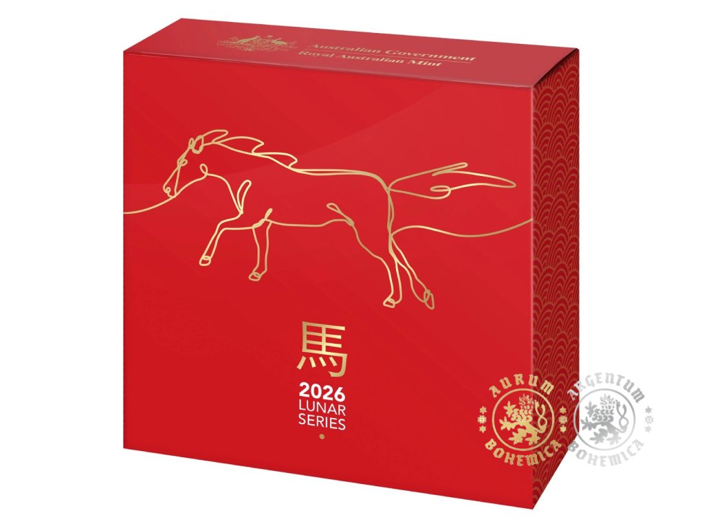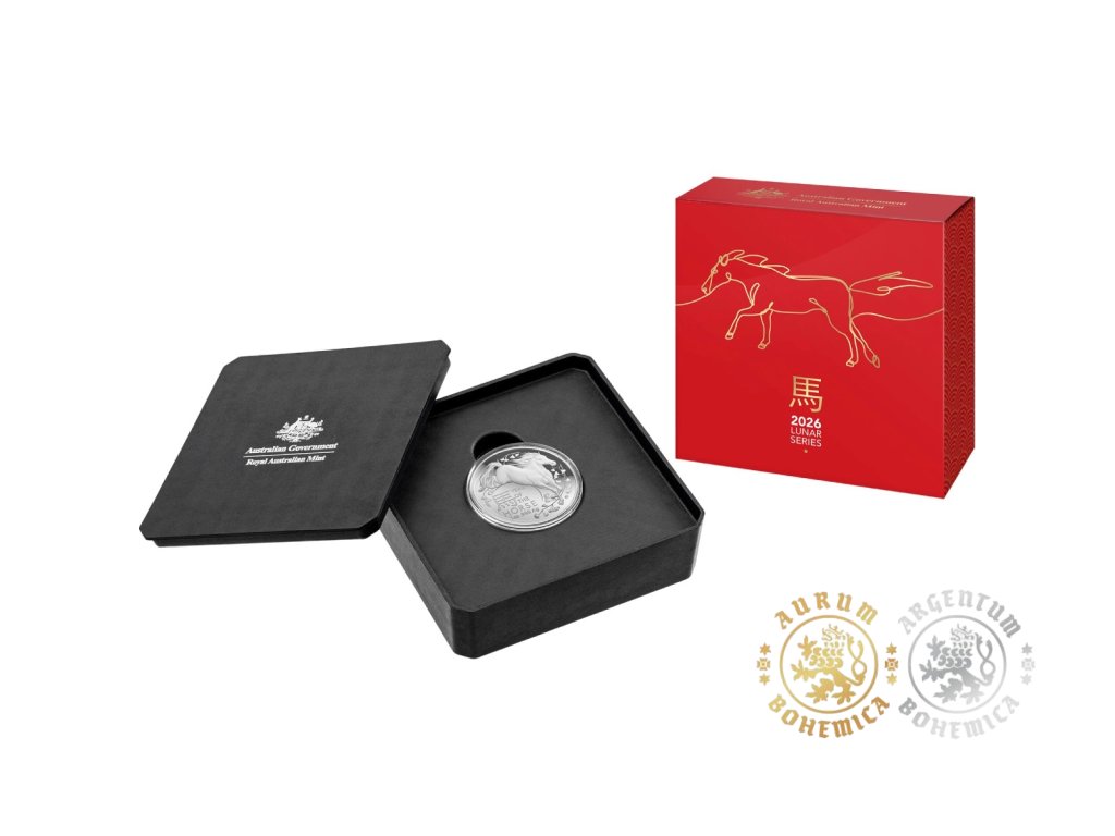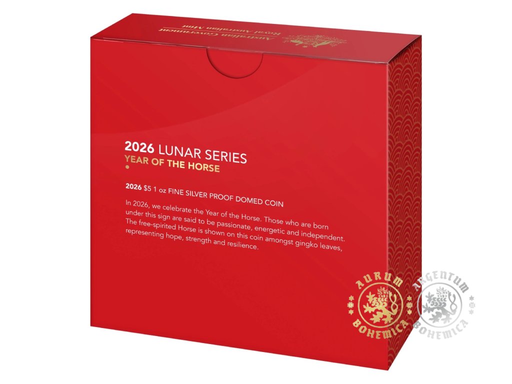 Tato jedinečná mince ve tvaru kopule je sedmým vydáním nové lunární série Královské australské mincovny a byla vyražena z jedné unce 99,9% stříbra. Stříbrná mince oslavuje rok koně v roce 2026 a je limitována pouze 7 500 kusy po celém světě. Motiv zobrazuje živého koně v cvalu spolu s nápisy „YEAR OF THE HORSE“ (Rok koně), čínským znakem pro „kůň“, hmotností a ryzostí. Na rubu je vyobrazeno lunární kalendářové kolo se všemi 12 zvířaty, portrét krále Karla III. od Dana Thorna, nominální hodnota a rok vydání uprostřed.