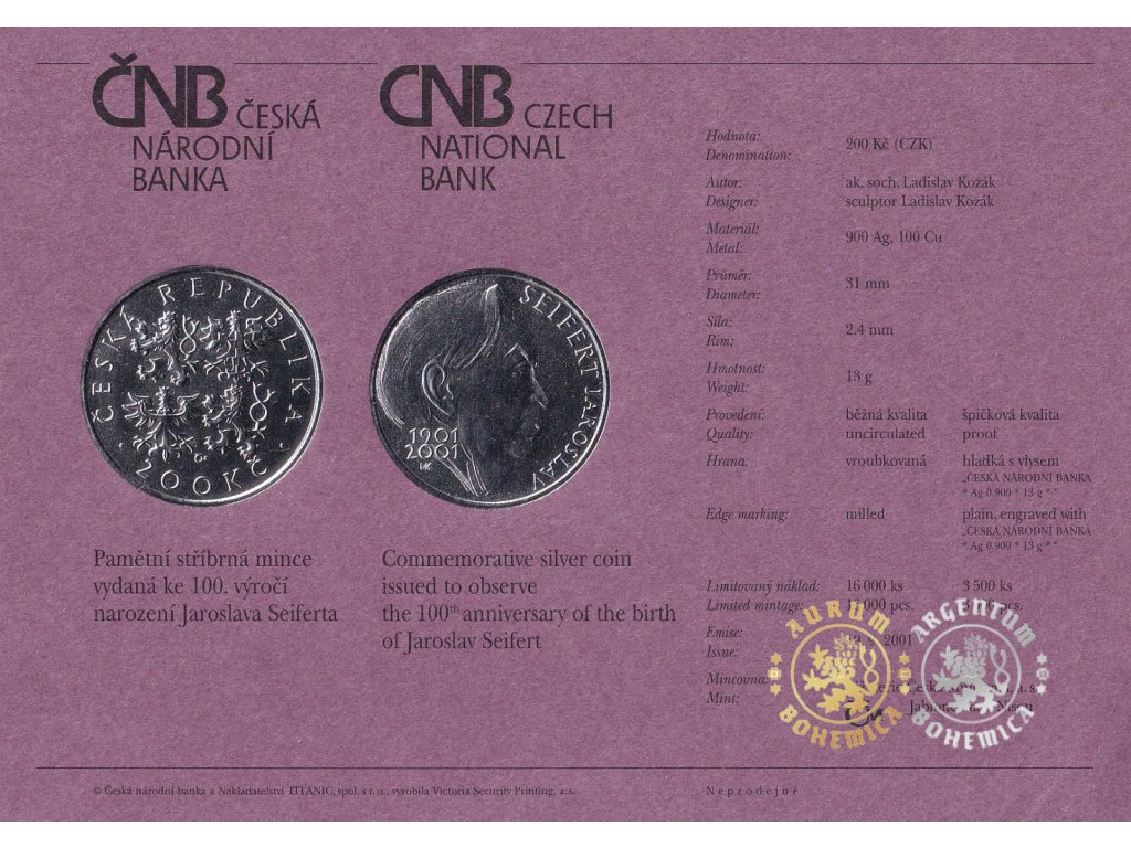 K příležitosti 100. výročí od narození Jaroslava Seiferta, jednoho z nejznámějších českých spisovatelů, který dostal Nobelovu cenu za literaturu, vydala Česká národní banka do oběhu stříbrnou 200 kč minci, a to 19. září roku 2001. Na lícní straně se nachází kompozice státních heraldických zvířat (lev, orel..) ve státním znaku a pod ním název státu České republiky. Na rubové straně mince se nachází portrét Jaroslava Seiferta a vedle něj letopočty "1901" a "2001". Na pravém okraji mince je neuzavřený opis jména skladatele a pod letopočty jsou iniciály "LK", které patří autoru návrhu této mince, Ladislavovi Kozákovi. Mince byla ražena Českou mincovnou v Jablonci nad Nisou v kvalitě Proof.