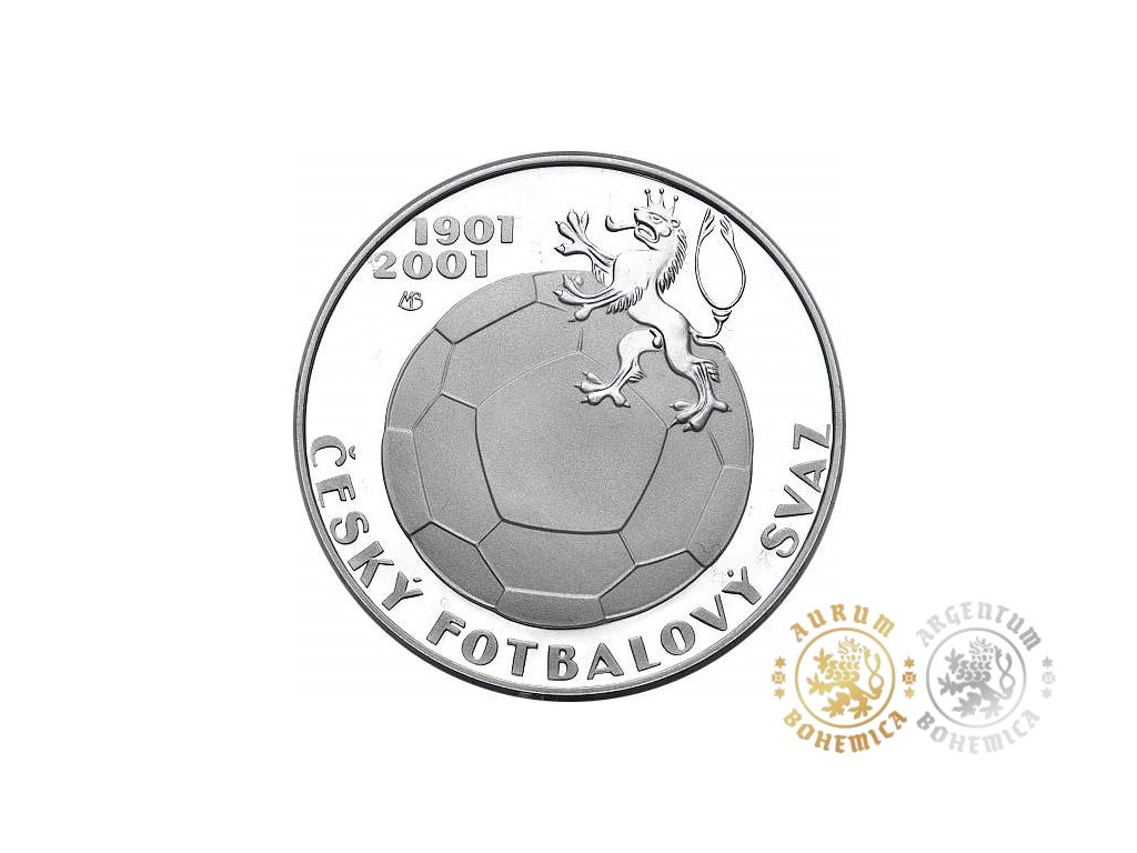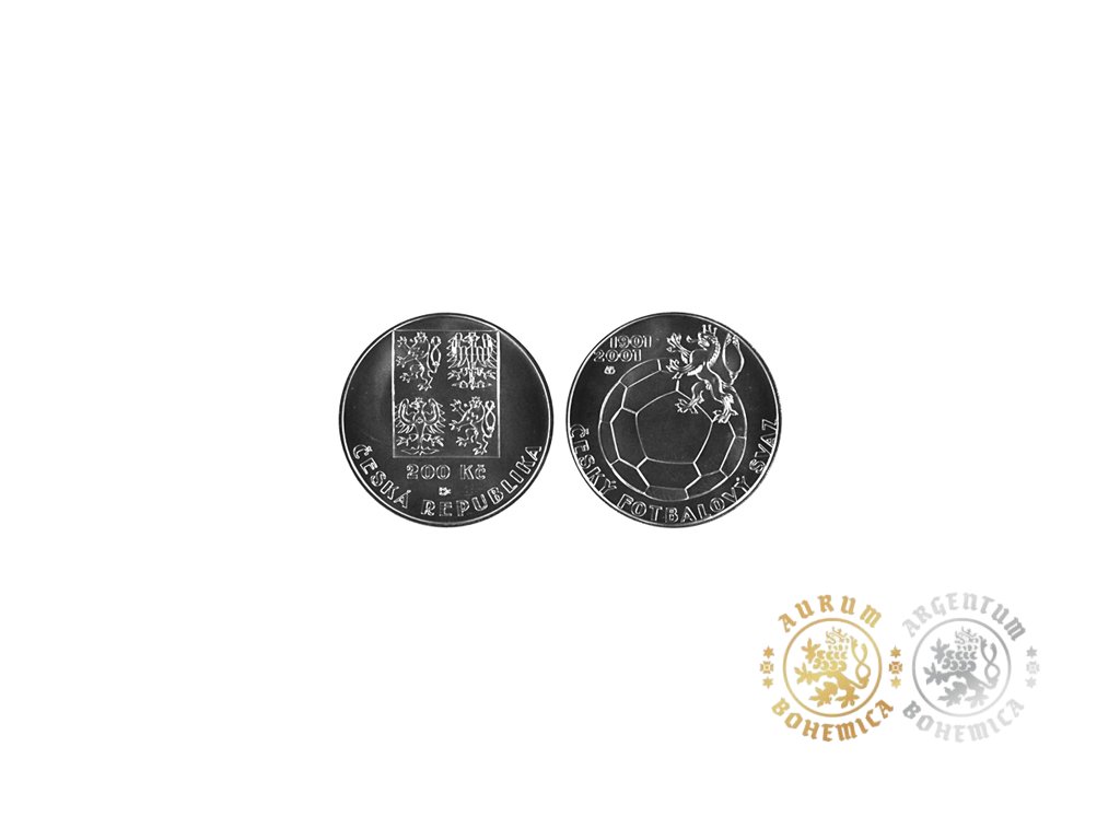 K příležitosti 100. výročí založení českého fotbalového svazu, vydala Česká národní banka do oběhu minci 200 kč, a to 5. září roku 2001. Na lícní straně mince se objevuje státní znak společně s názvem "Česká republika" ve spodním kraji mince a nominální hodnota "200 kč". Rubovou stranu ozdobuje velký fotbalový míč a na něm český lev v pravém horním rohu. Vedle míče jsou umíštěny letopočty "1901" a "2001" a pod nimi iniciály autorky "MB" - Mileny Blaškové. Ražena byla mince Českou mincovnou v Jablonci nad Nisou v kvalitě Proof.