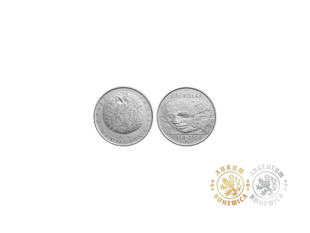 Dnem 24. Září roku 2014 vydala k 100. výročí narození Jiřího Koláře Česká národní banka pamětní stříbrnou minci v hodnotě 500 kč. Na lícní straně mince je motiv jablka, které je polepeno texty ztvárněnými Kolářem užívanou výtvarnou technikou chiasmáže. Dále je na lícní straně jméno státu "ČESKÁ REPUBLIKA" a nominální hodnota ve výši 500 kč. Na rubové straně mince se nachází portrét Jiřího Koláře ztvárněný technikou roláže. Nad portrétem je nápis „JIŘÍ KOLÁŘ“ a pod portrétem jsou letopočty „1914 – 2014“. Autorem lícní strany mince je Jiří Věneček a té rubové - Martin Dašek. Mince byla ražena v Jablonci nad Nisou a to v provedení Proof.