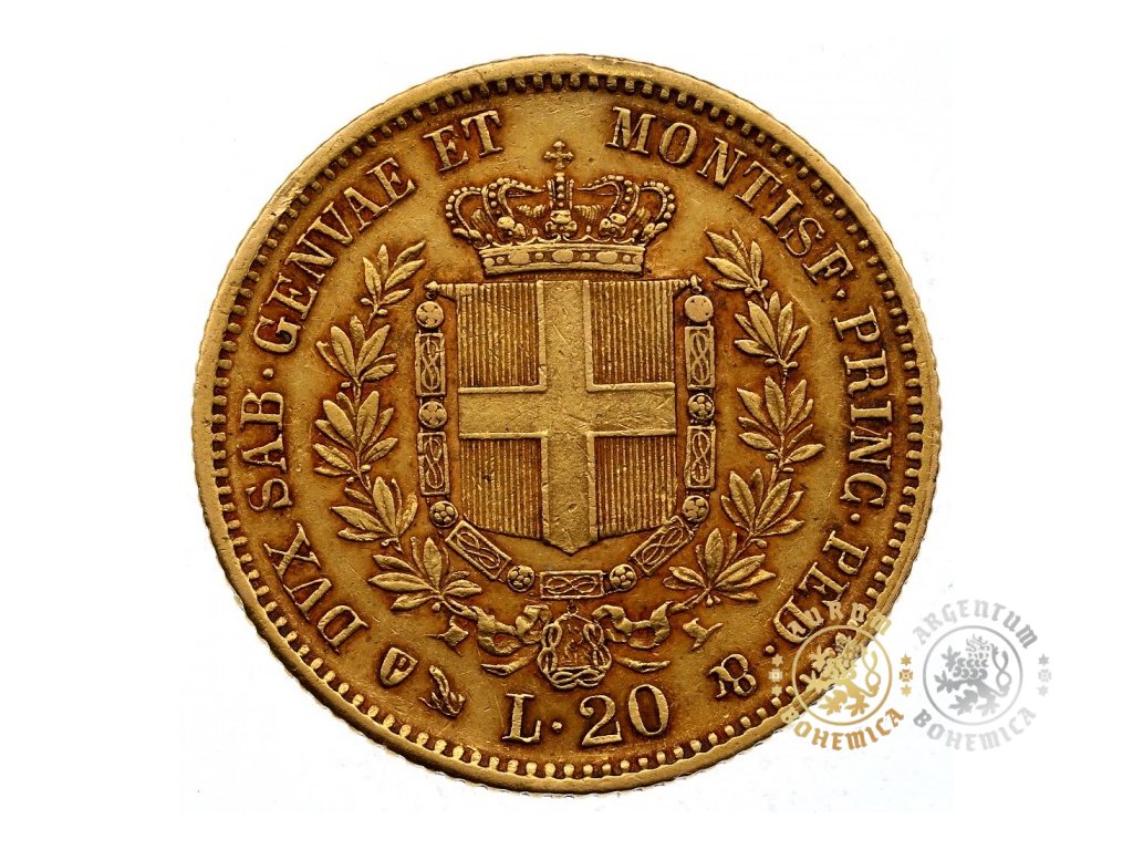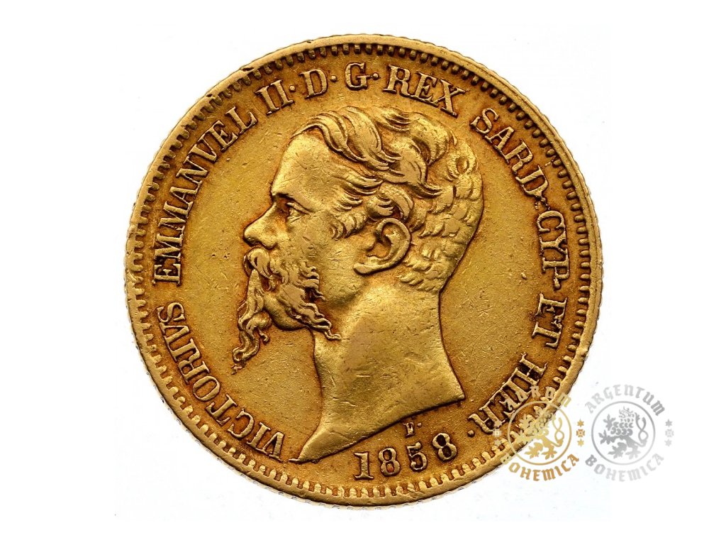 Zlatá mince v hodnotě 20 lir s portrétem Viktora Emanuela II. z roku 1858 pochází z období těsně před sjednocením Itálie. V té době Itálie jako jednotný stát ještě neexistovala – poloostrov byl rozdělen do několika samostatných celků, mezi nimiž bylo i Sardinské království, kterému Viktor Emanuel II. vládl. Tento stát, s centrem v Piemontu a Turíně, byl nejmodernějším a nejliberálnějším ze všech italských státních útvarů, a právě z něj vzešla iniciativa k vytvoření jednotné Itálie.