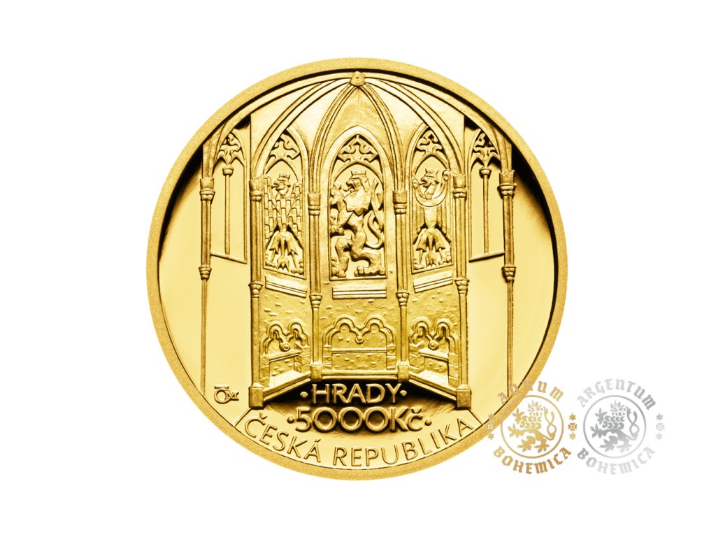 Na lícní straně mince je zobrazen interiér hradní kaple. Vnitřní plochy oken vyplňuje kompozice heraldických zvířat z velkého státního znaku. Uprostřed je český lev, vlevo od něj moravská orlice a vpravo od něj slezská orlice. Ve spodní části jsou ve dvou řádcích umístěny název cyklu „HRADY“ a označení nominální hodnoty mince se zkratkou peněžní jednotky „5 000 Kč“, které jsou na začátku a na konci ohraničené tečkami. Název státu „ČESKÁ REPUBLIKA“ je v opisu při spodním okraji mince. Značka České mincovny, která je tvořena kompozicí písmen „Č“ a „M“, je vlevo od názvu státu.