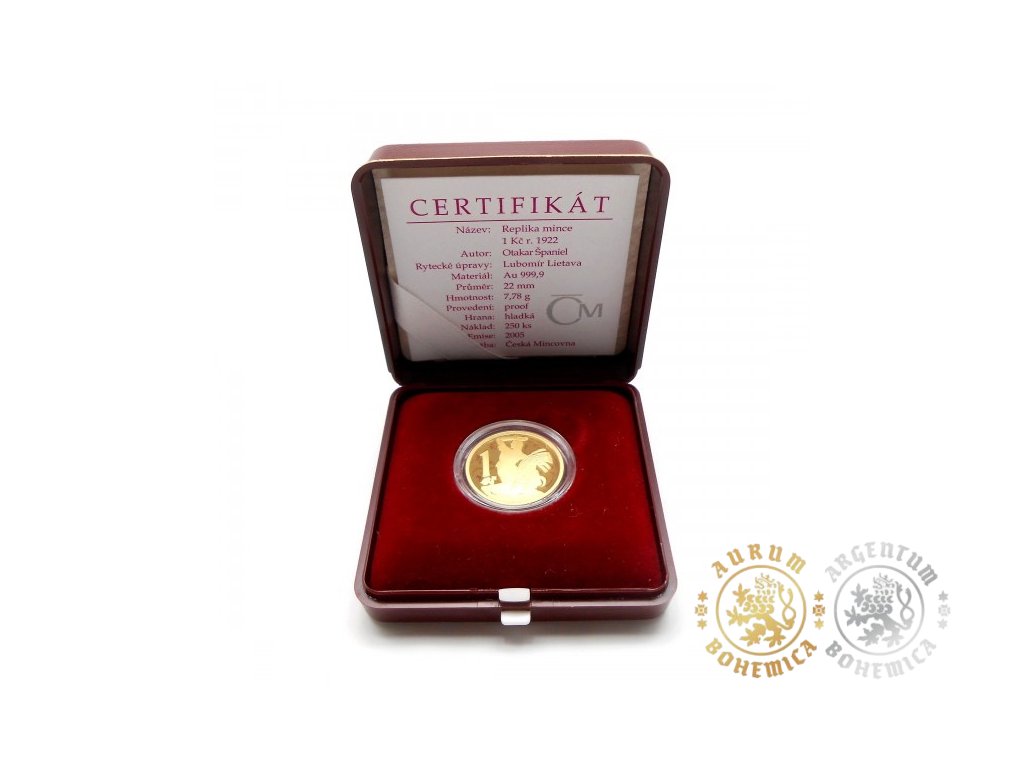 Zlatá replika mince 1 Kč z roku 1922 PROOF 2005